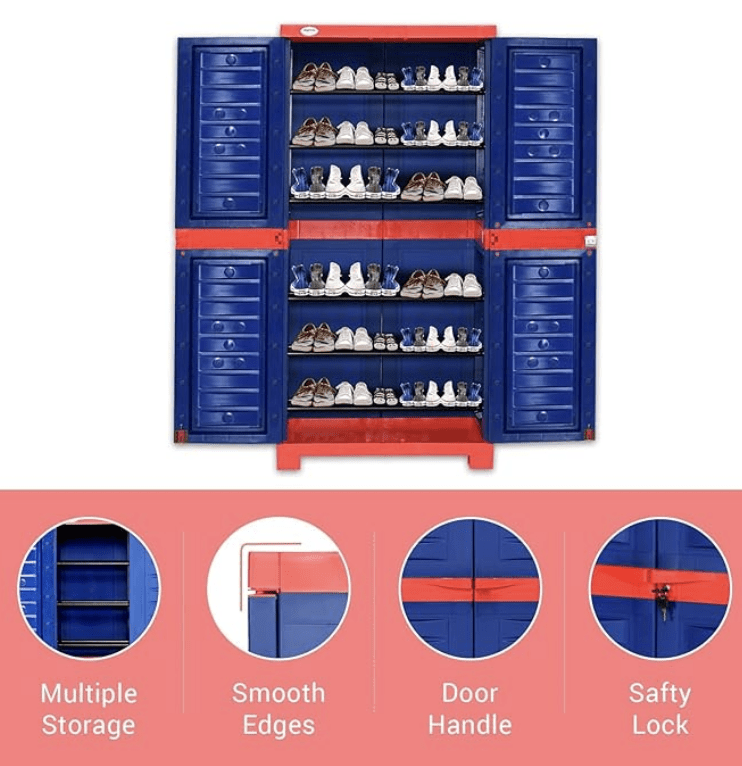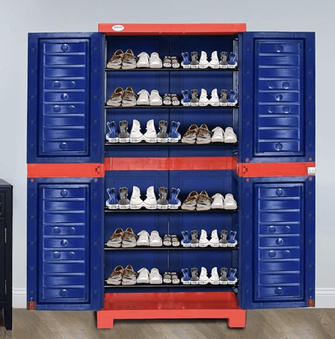 घर के लिए सुप्रीम फ्यूज़न प्लास्टिक शू रैक (मध्यम आकार, कोक लाल और नीला)