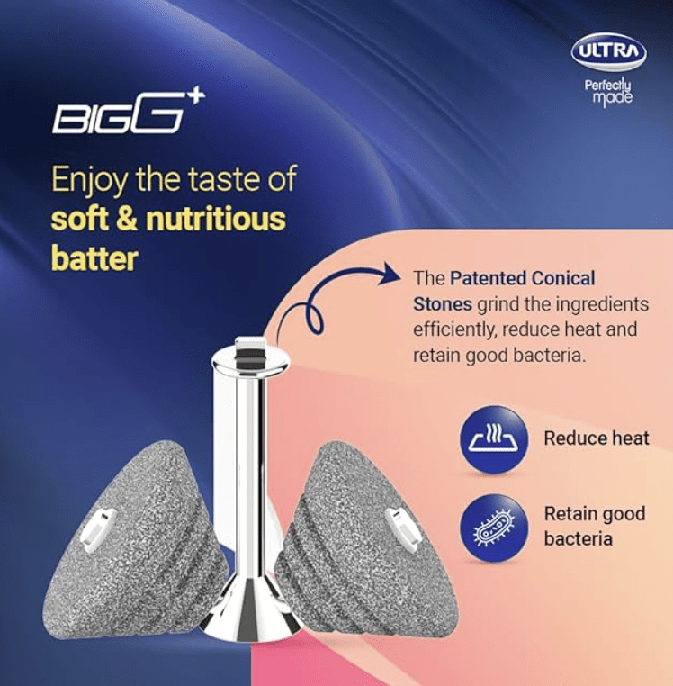 पेटेंट शंक्वाकार पत्थरअल्ट्रा वेट ग्राइंडर के पेटेंटेड शंक्वाकार ग्राइंडिंग स्टोन पीसते समय कम गर्मी पैदा करते हैं, जिससे किण्वन में तेज़ी आती है। इसका मतलब न सिर्फ़ मुलायम और फूली हुई इडली, बल्कि ज़्यादा संख्या में इडली भी बनती हैं। बेहतरीन इंजीनियरिंग की दक्षता और प्रचुरता, दोनों का आनंद लें। |