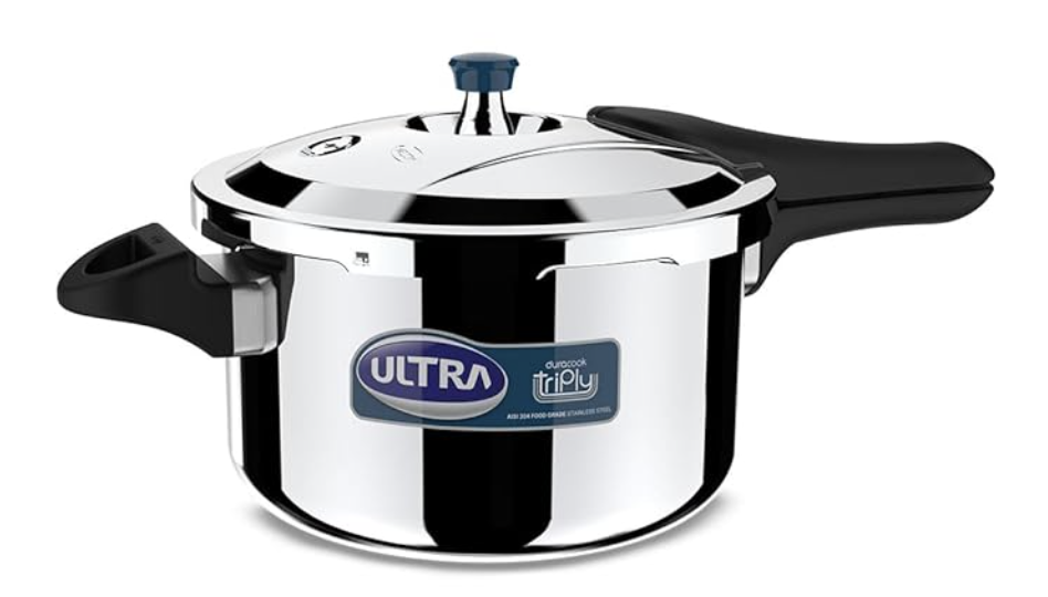 अल्ट्रा ड्यूराकूक ट्रिपली प्रेशर कुकर 5.5 लीटर | AISI 304 फ़ूड ग्रेड स्टेनलेस स्टील कुकर | 5 साल की वारंटी | इंजेक्शन मोल्डेड हैंडल | इंडक्शन कम्पैटिबल चौड़ा बेस | नॉन-स्टिक फ़िनिश