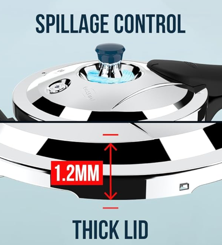 - 1.2 मिमी मोटा ढक्कन: सुरक्षा और अतिरिक्त सुरक्षा के लिए इस कुकर में 1.2 मिमी मोटा ढक्कन है। यह मोटा ढक्कन पके हुए खाने की गर्मी को भी बरकरार रखता है, जिससे वह लंबे समय तक गर्म रहता है।