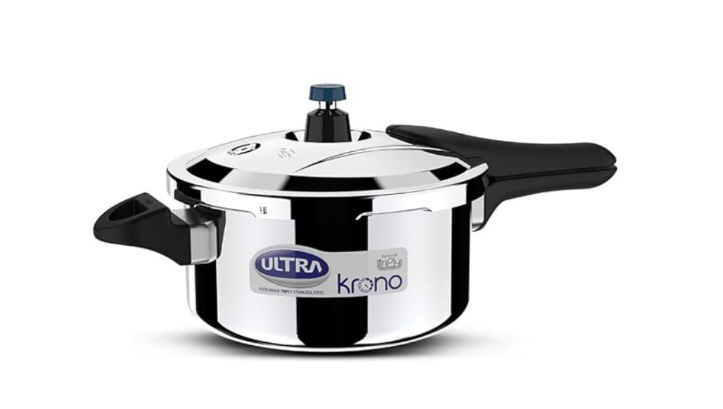 अल्ट्रा ट्रिपली क्रोनो प्रेशर कुकर 4.5 लीटर | सीटी काउंटर | स्पिलेज कंट्रोल | AISI 304 फ़ूड ग्रेड स्टेनलेस स्टील कुकर | 5 साल की वारंटी | 1.2 MM ढक्कन की मोटाई | इंडक्शन कम्पैटिबल