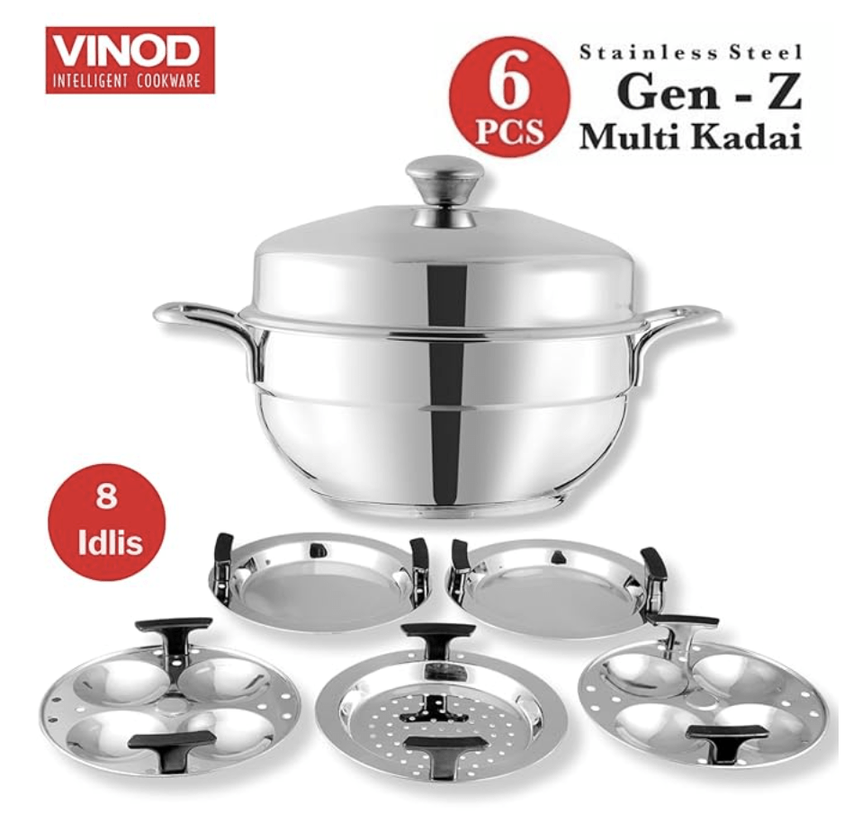 विनोद जेन-ज़ेड स्टेनलेस स्टील मल्टी कढ़ाई 6 प्लेटों के साथ - 19 सेमी | 2 इडली, 2 ढोकला और 1 पात्रा प्लेट | ऑल इन वन मल्टी पर्पस कढ़ाई | इंडक्शन और गैस बेस | छोटा - 2 साल की वारंटी