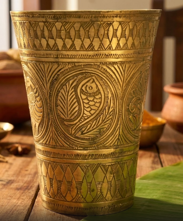 वेलन स्टोर से पेश है अद्वितीय नक्काशीदार डिज़ाइन वाला उत्तम शुद्ध पीतल का विंटेज लस्सी ग्लास।
