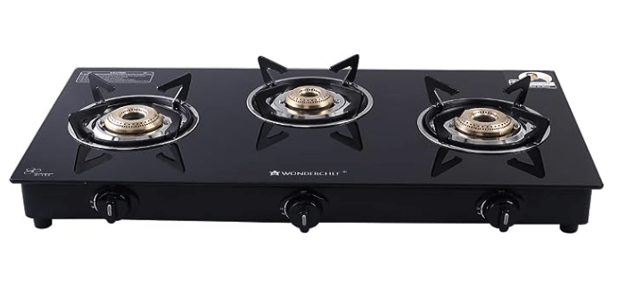 वंडरशेफ प्लैटिनम प्लस 3 बर्नर ऑटो ग्लास कुकटॉप 6 मिमी टफन्ड ग्लास कुकटॉप स्टेनलेस स्टील ड्रिप ट्रे एंटी स्किड लेग्स बड़े पैन सपोर्ट पाइज़ो के साथ ऑटो इग्निशन गैस लाइटर की आवश्यकता नहीं