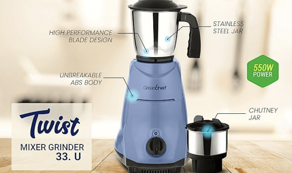 Greenchef Twist (550 Watt) Mixer Grinder with 2 Stainless Steel Jar,Blue.