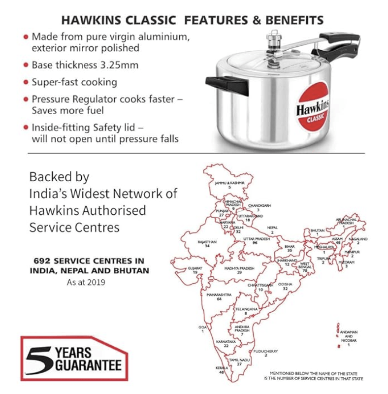 Hawkins Classic Aluminium Inner Lid Pressure Cooker, 5 Litre, Silver (CL50)