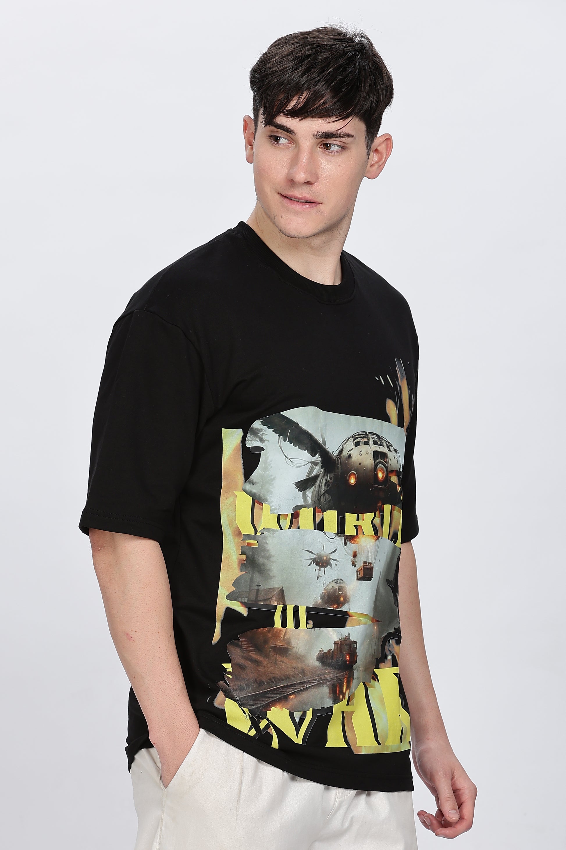Make a bold statement with this Men Graphic Print Round Neck Cotton Blend Black T-Shirt, designed for men who love edgy, modern streetwear. Featuring a striking futuristic graphic print inspired by action, machines, and cinematic visuals, this t-shirt adds instant attitude to your casual wardrobe.