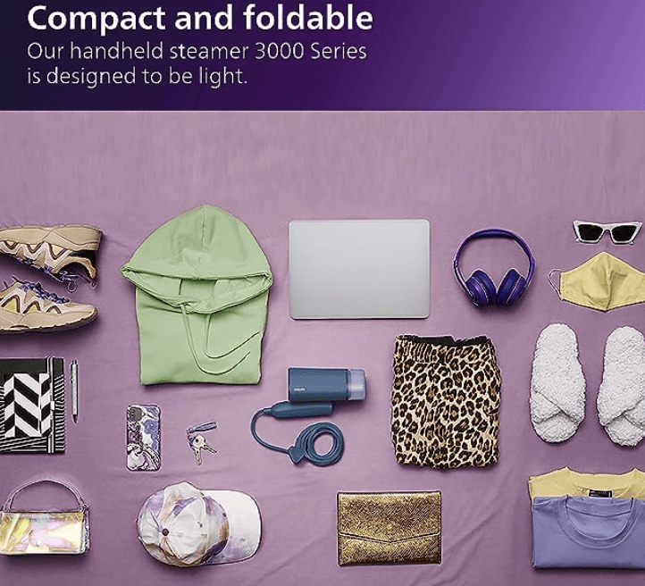PHILIPS Handheld Garment Steamer STH3000/20 - Compact & Foldable, Convenient Vertical Steaming, 1000 Watt Quick Heat Up, up to 20g/min, Kills 99.9%* Bacteria (Reno Blue), Small