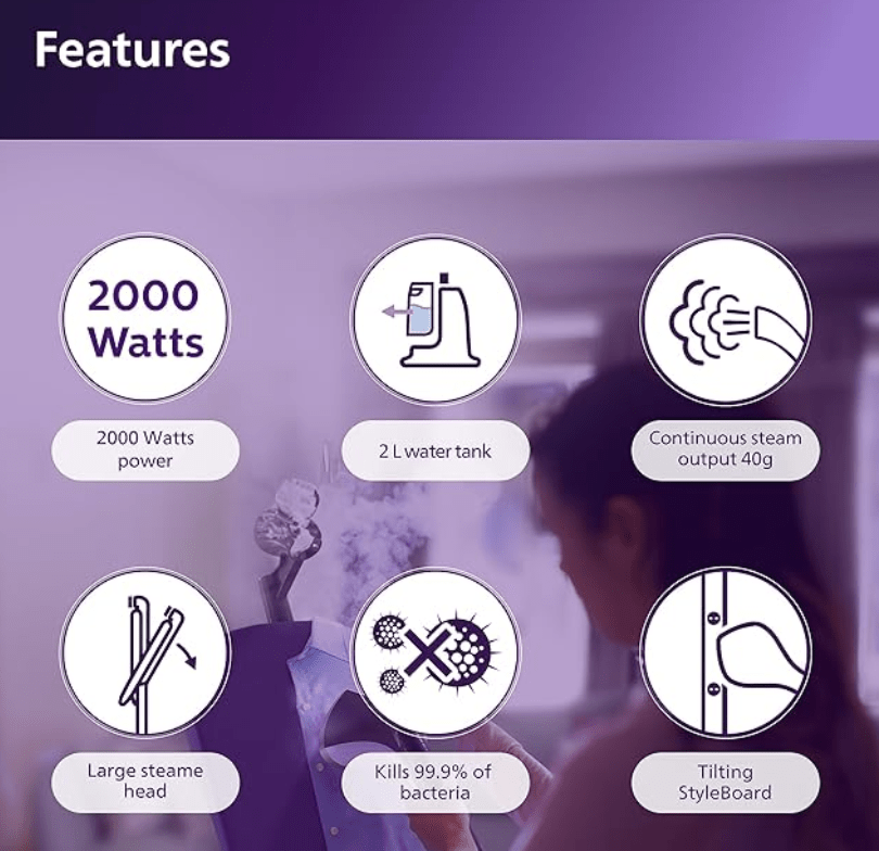 Philips Standing Garment Steamer STE3160/30 – 2000 watts power, Unique tilting style board, 3 steam settings, up to 40 g/min steam output