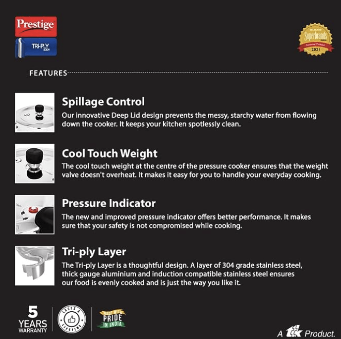 Prestige Svachh Triply Outer Lid Pressure Cooker with Unique Deep Lid for Spillage Control, 2 Litre, Silver, 304 Stainless Steel Inner Surface, Thick Gauge Aluminium