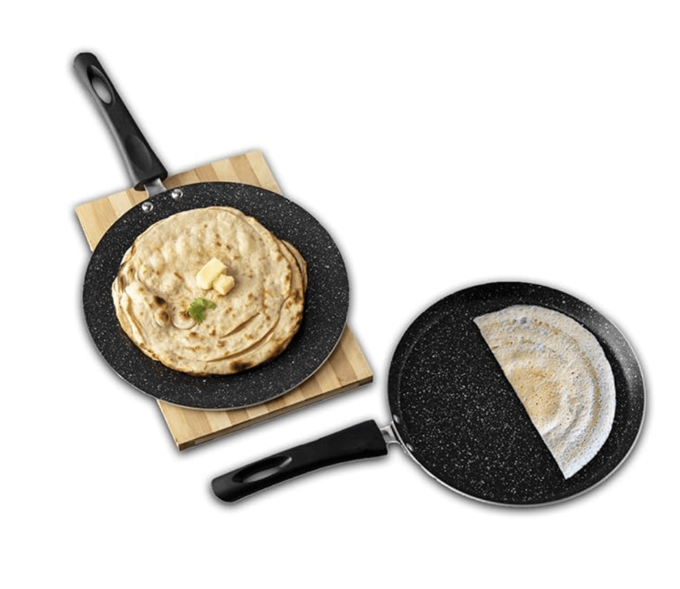 Cookware Set of 2The nonstick 2-piece cookware tawa includes all the essentials for everyday cooking. this contemporary kitchen tawa offers the versatility and quality discerning cooks demand. the non-stick surface requires no extra cooking oils or butter, helping you lose weight by cutting calories - not to mention making clean up a breeze with simple one-swipe cleaning. |