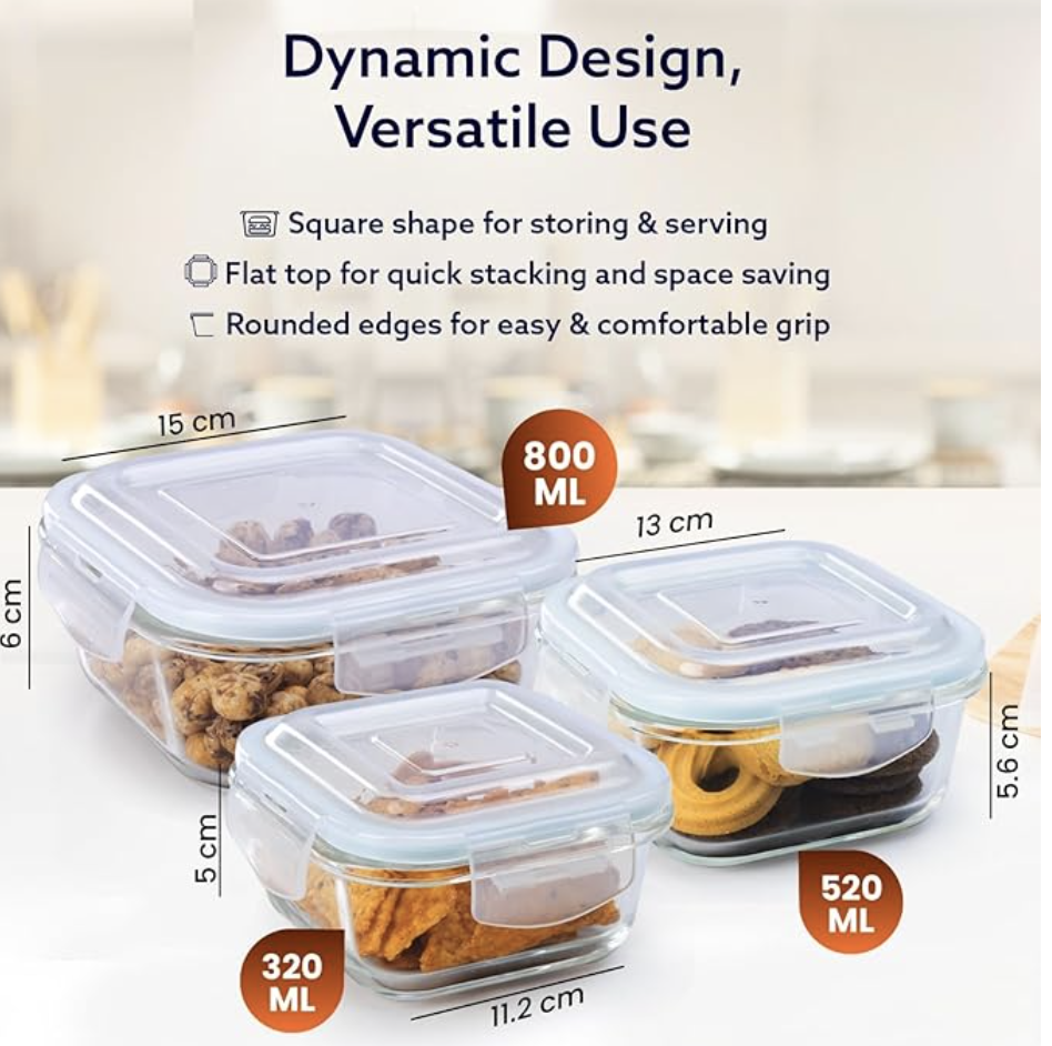 மூடிகளுடன் கூடிய AGARO போரோசிலிகேட் கண்ணாடி கொள்கலன், 3 பிசிக்கள் தொகுப்பு, 320மிலி, 520மிலி & 800மிலி, மைக்ரோவேவ், ஓவன் & ஃப்ரீசர் சேஃப், பேக்கிங் டிஷ், சதுரம், பேக்கிங் டிரே, கீறல் எதிர்ப்பு, வெளிப்படையானது