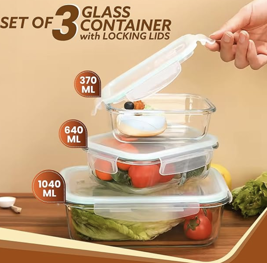 மூடிகளுடன் கூடிய AGARO போரோசிலிகேட் கண்ணாடி கொள்கலன்கள், 3 பிசிக்கள் தொகுப்பு, 370மிலி, 640மிலி & 1040மிலி, சமையலறை, மைக்ரோவேவ், ஓவன் & ஃப்ரீசர் சேஃப், பேக்கிங் டிஷ், செவ்வகம், பேக்கிங் டிரே, கீறல் எதிர்ப்பு, வெளிப்படையானது