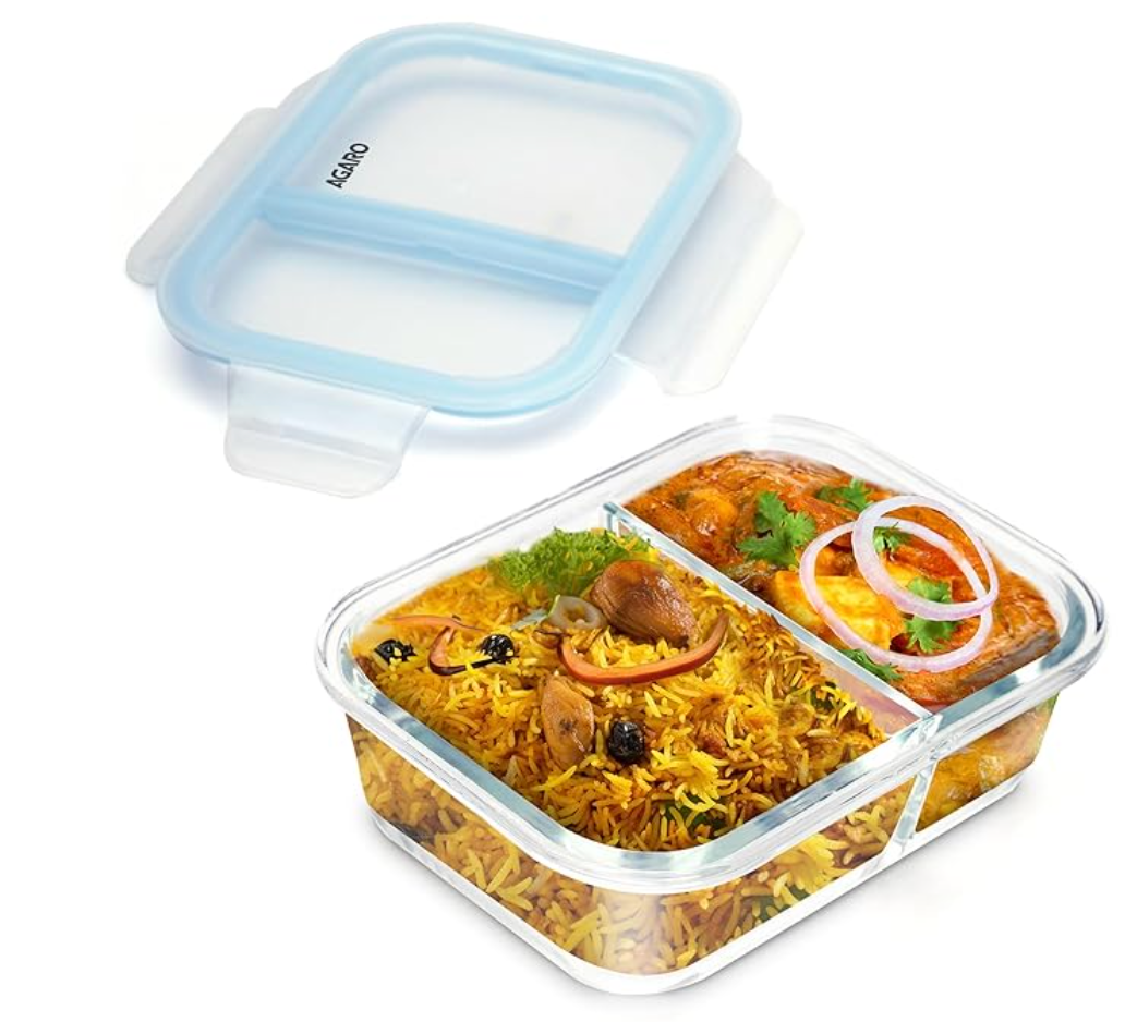 AGARO கம்பார்ட்மென்ட் மதிய உணவுப் பெட்டி/கொள்கலன் 600 மில்லி, ஆண்கள் மற்றும் பெண்களுக்கான அலுவலக டிபன் பெட்டி, போரோசிலிகேட் கண்ணாடி உடல், மைக்ரோவேவ் ஓவன் பாதுகாப்பானது, கசிவு இல்லாத பூட்டு மூடி, அலுவலகத்திற்கான காற்று புகாத டிபன், டிரான்ஸ்பரன்ட்