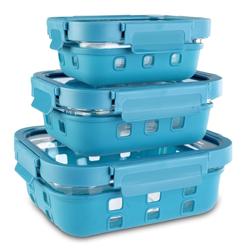 சிலிகான் ஸ்லீவ்ஸ் & லாக் மூடியுடன் கூடிய AGARO இம்பீரியல் கண்ணாடி கொள்கலன்கள், 3 பிசிக்கள் செட், போரோசிலிகேட் கண்ணாடி, செவ்வக வடிவம், டிரான்ஸ்பரன்ட், மைக்ரோவேவ் மற்றும் ரெஃப்ரிஜிரேட்டர் சேஃப், 370மிலி, 640மிலி, 1050மிலி, சியான்