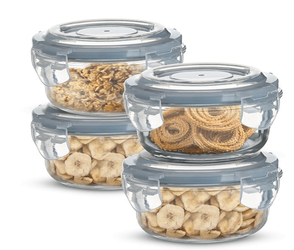 சமையலறைக்கான பெர்க்னர் போரோசிலிகேட் கண்ணாடி பக்கவாட்டு பூட்டு வட்ட சேமிப்பு கொள்கலன், காற்று புகாத மற்றும் கசிவு இல்லாத மூடி, BPA இல்லாதது, மைக்ரோவேவ் மற்றும் ஓவன் பாதுகாப்பானது, நீக்கக்கூடிய சிலிகான் ஐஸ் ப்ளூ கேஸ்கெட், ஒவ்வொன்றும் 400 மில்லி (4 தொகுப்பு)