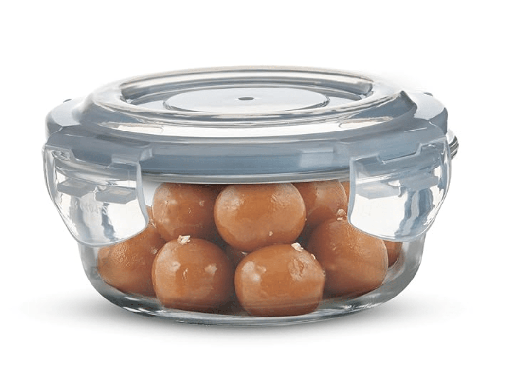 BERGNER போரோசிலிகேட் கண்ணாடி பக்கவாட்டு பூட்டு சுற்று சேமிப்பு கொள்கலன் சமையலறைக்கு காற்று புகாத மற்றும் கசிவு இல்லாத மூடி, BPA இல்லாதது, மைக்ரோவேவ் மற்றும் ஓவன் பாதுகாப்பானது, நீக்கக்கூடிய சிலிகான் ஐஸ் ப்ளூ கேஸ்கெட் (400 மிலி), வெளிப்படையானது.