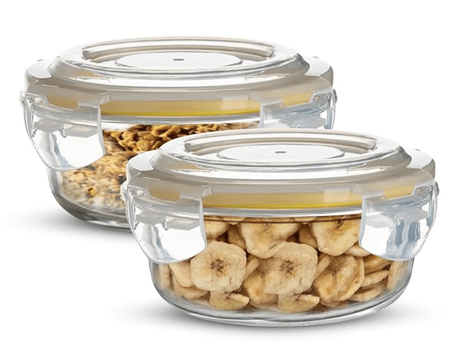 சமையலறைக்கான BERGNER போரோசிலிகேட் கண்ணாடி பக்கவாட்டு பூட்டு வட்ட சேமிப்பு கொள்கலன், காற்று புகாத மற்றும் கசிவு இல்லாத மூடி, BPA இல்லாதது, மைக்ரோவேவ் மற்றும் ஓவன் பாதுகாப்பானது, நீக்கக்கூடிய சிலிகான் மஞ்சள் கேஸ்கெட், ஒவ்வொன்றும் 400 மில்லி (2 தொகுப்பு)