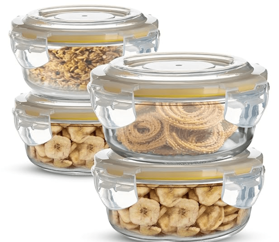 சமையலறைக்கான BERGNER போரோசிலிகேட் கண்ணாடி பக்கவாட்டு பூட்டு வட்ட சேமிப்பு கொள்கலன், காற்று புகாத மற்றும் கசிவு இல்லாத மூடி, BPA இல்லாதது, மைக்ரோவேவ் மற்றும் ஓவன் பாதுகாப்பானது, நீக்கக்கூடிய சிலிகான் மஞ்சள் கேஸ்கெட், ஒவ்வொன்றும் 400 மில்லி (4 தொகுப்பு)