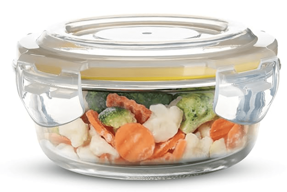 சமையலறைக்கான BERGNER போரோசிலிகேட் கண்ணாடி பக்கவாட்டு பூட்டு வட்ட சேமிப்பு கொள்கலன், காற்று புகாத மற்றும் கசிவு இல்லாத மூடி, BPA இல்லாதது, மைக்ரோவேவ் மற்றும் ஓவன் பாதுகாப்பானது, நீக்கக்கூடிய சிலிகான் மஞ்சள் கேஸ்கெட் (400 மிலி), வெளிப்படையானது.