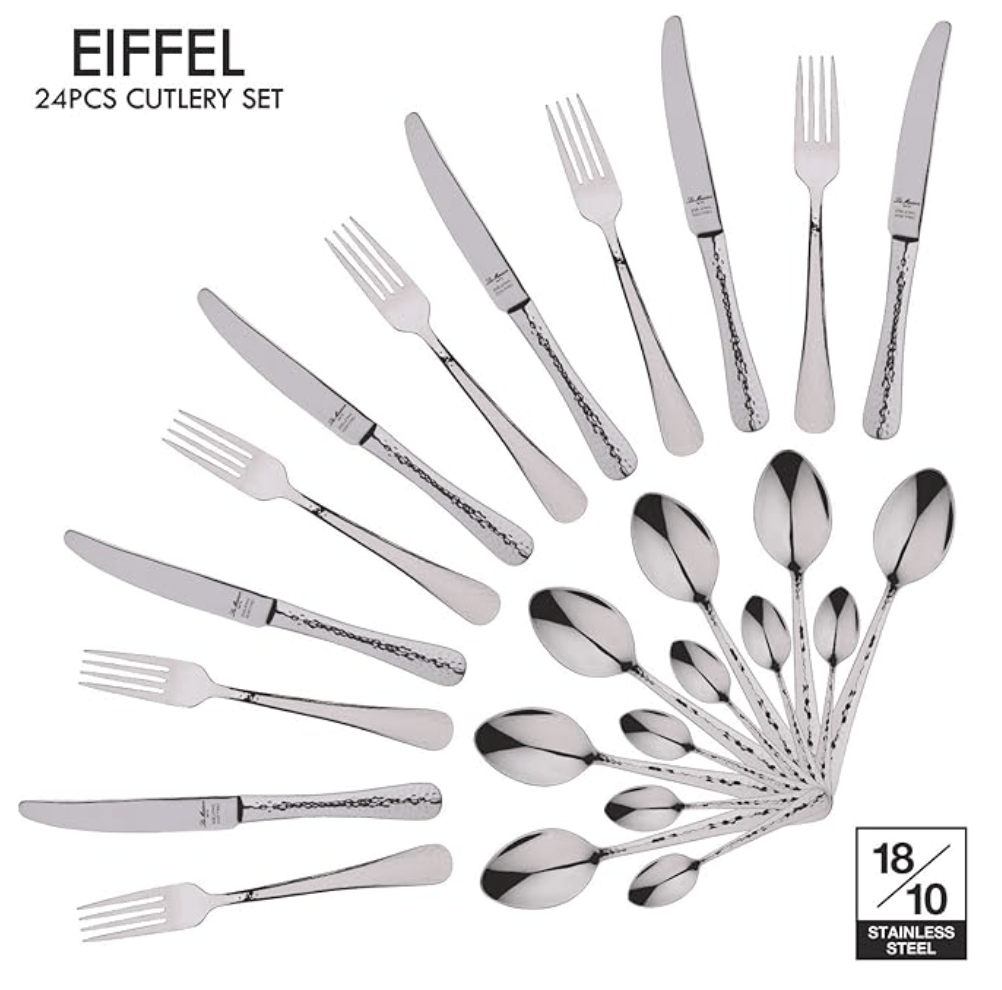 பெர்க்னர் ஈபிள் 304 கிரேடு, 18/10 ஸ்டெயின்லெஸ் ஸ்டீல் - 24 பிசிக்கள் கட்லரி செட் (இதில் உள்ளவை: 6 டேபிள் கத்தி, 6 டேபிள் ஃபோர்க், 6 டேபிள் ஸ்பூன், 6 டீ ஸ்பூன்)
