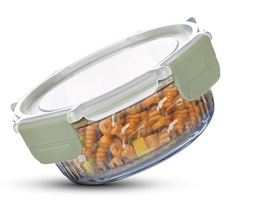 சமையலறை/டிஃபினுக்கான BERGNER ஸ்மார்ட் லாக் போரோசிலிகேட் சுற்று 620மிலி உணவு கொள்கலன், பூட்டும் தாவல்களுடன் காற்று புகாத மூடி, இடத்தை சேமிக்கும், அடுக்கக்கூடிய, மைக்ரோவேவ் மற்றும் ஓவன் பாதுகாப்பானது, உணவு பாதுகாப்பானது, பாத்திரங்கழுவி பாதுகாப்பானது - பச்சை