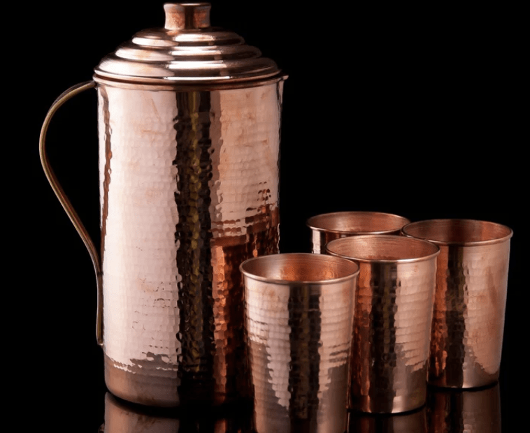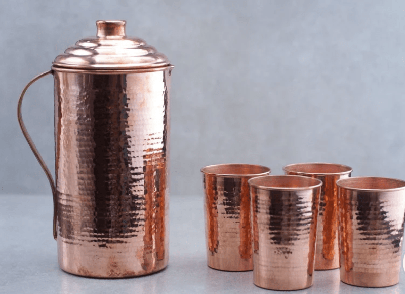 செம்பு நீர் குடம் மற்றும் டம்ளர்: 1 செம்பு குடம் மற்றும் 4 செம்பு கண்ணாடிகளின் தொகுப்பு