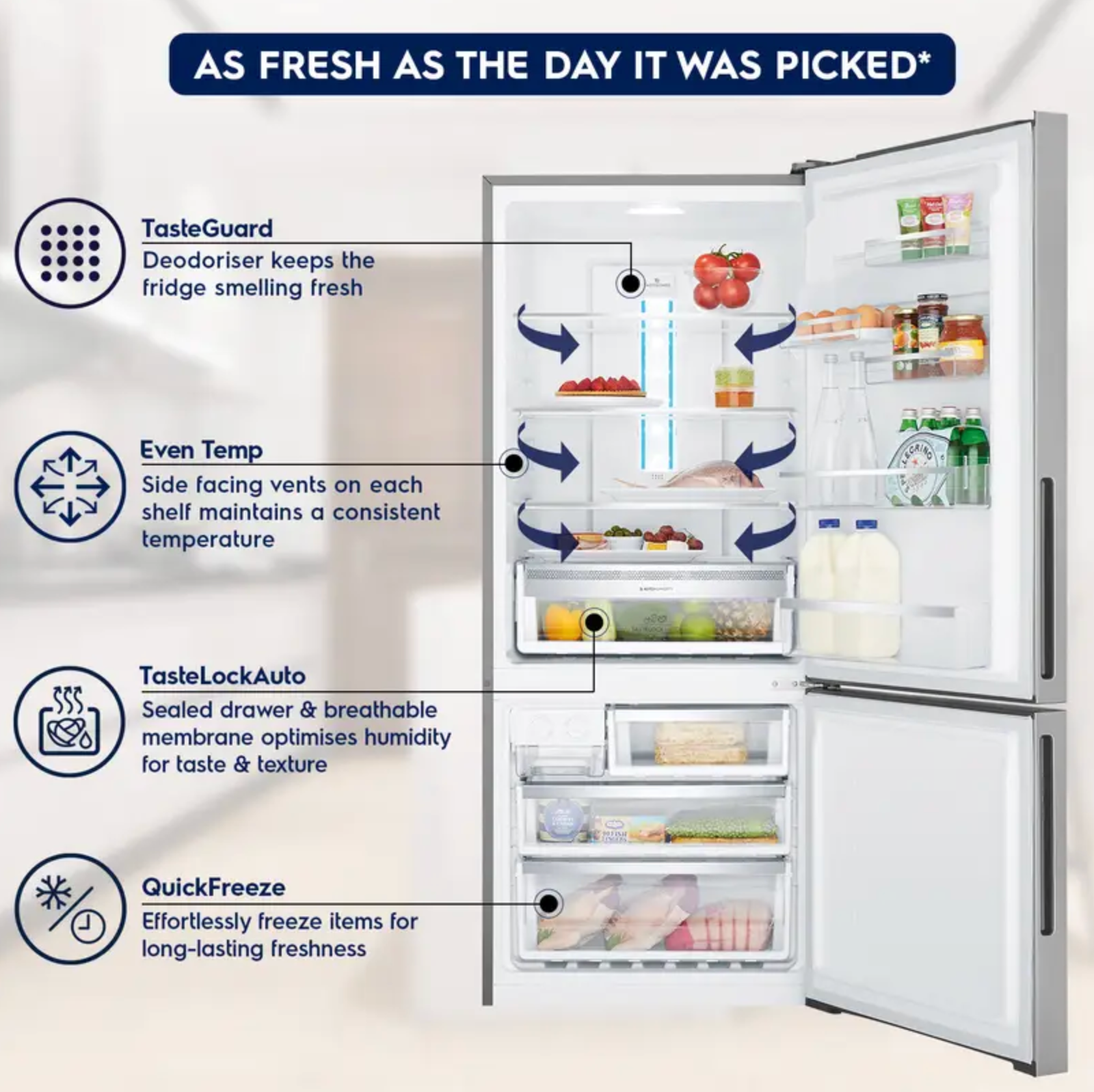 இந்த குளிர்சாதன பெட்டியில் EvenTemp கூலிங் தொழில்நுட்பம் இருப்பதால், இது வெப்பநிலை ஏற்ற இறக்கங்களைக் குறைத்து, உங்கள் சேமித்து வைக்கப்பட்ட பொருட்கள் நீண்ட காலத்திற்கு புதியதாக இருப்பதை உறுதி செய்கிறது. ஒவ்வொரு அலமாரியையும் தனித்தனியாக குளிர்விப்பதன் மூலம், முழு பெட்டியிலும் ஒரு நிலையான வெப்பநிலை பராமரிக்கப்பட்டு, நீண்ட காலத்திற்கு சுவை மற்றும் அமைப்பைப் பாதுகாக்கிறது.