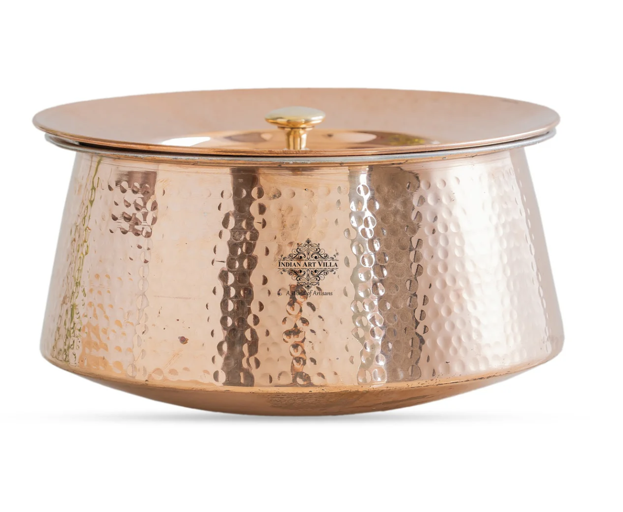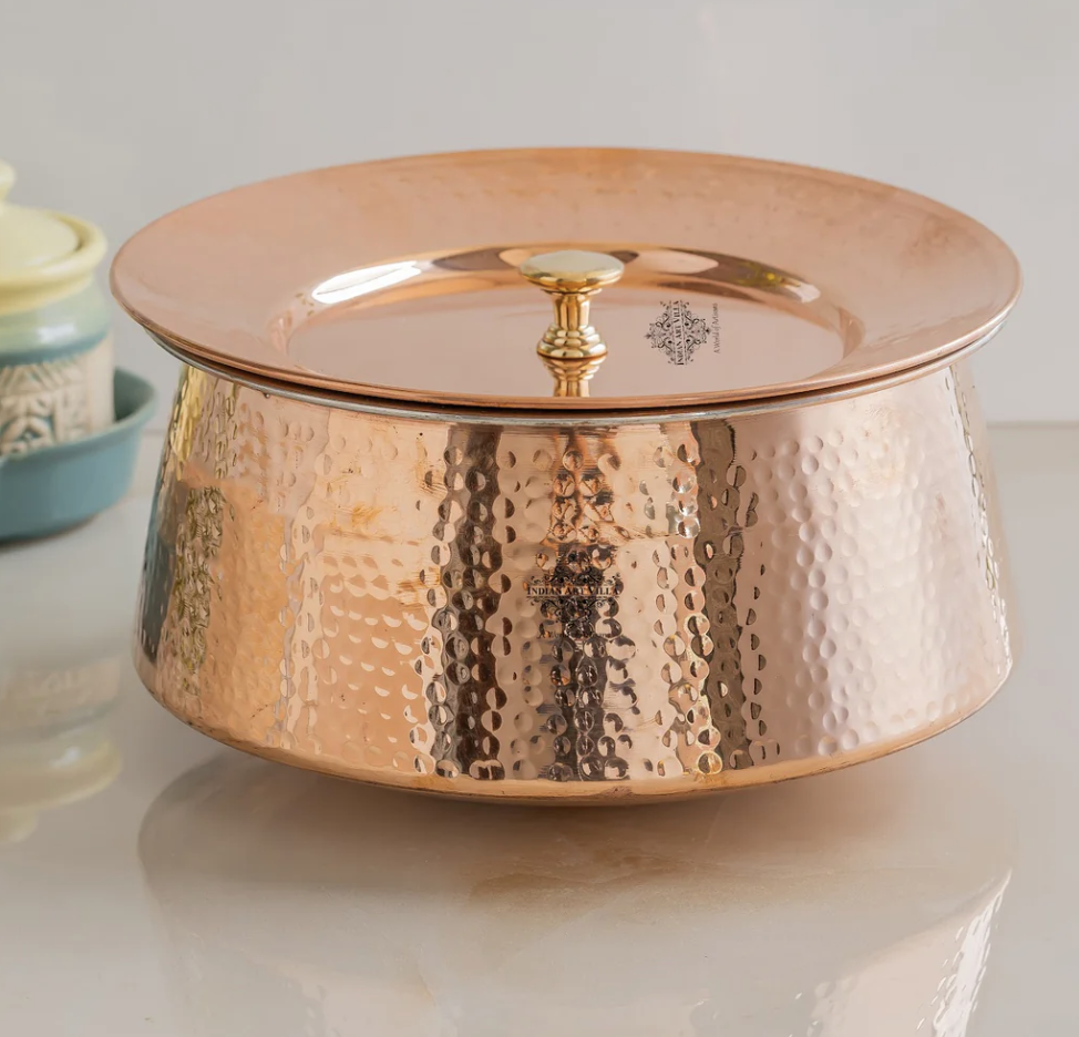 தூய பித்தளையால் ஆனது, இது நீடித்து உழைக்கும் தன்மையை உறுதி செய்வதோடு, உங்கள் உணவுகளை நீண்ட நேரம் சூடாக வைத்திருக்க வெப்பத்தைத் தக்கவைத்துக்கொள்ளும். இறுக்கமான-பொருத்தமான மூடி ஒரு நேர்த்தியான தொடுதலைச் சேர்க்கிறது மற்றும் சுவைகளைப் பாதுகாக்க உதவுகிறது, அதே நேரத்தில் இரட்டை கைப்பிடிகள் நேர்த்தியுடன் பரிமாறுவதை எளிதாக்குகின்றன.