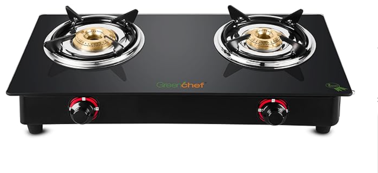 கிரீன்செஃப் எபோனி மைல்ட் ஸ்டீல் - பவுடர் கோடட் மேனுவல் 2 பர்னர் கிளாஸ் டாப் கேஸ் ஸ்டவ் (கருப்பு)