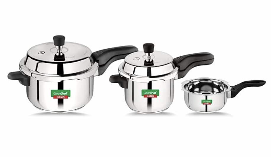 கிரீன்செஃப் புதிய வெளியீட்டு ஸ்டெய்ன்லெஸ் ஸ்டீல் பிரஷர் குக்கர் நமோ காம்போ (5லி+3லி+2லி) 5 லி, 3 லி, 2 லி வெளிப்புற மூடி இண்டக்ஷன் பாட்டம் பிரஷர் குக்கர் & பிரஷர் பான்.
