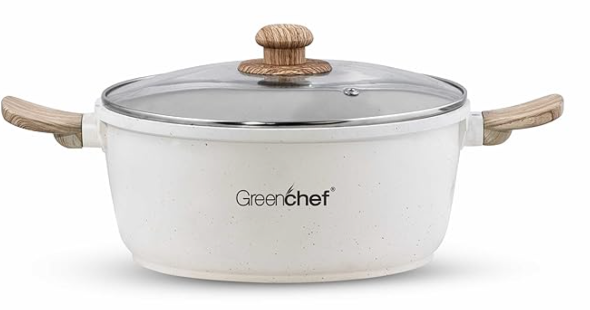 கிரீன்செஃப் பெப்பிள் கிரானைட் நான் ஸ்டிக் கேசரோல், கண்ணாடி மூடியுடன், 3 லிட்டர்/22 செ.மீ., வார்ப்பு அலுமினிய உடல், ஸ்டியூ பானை, பிரியாணி பானை, அரிசி பானை, கனமான அடிப்பகுதி, PFOA இலவசம்.