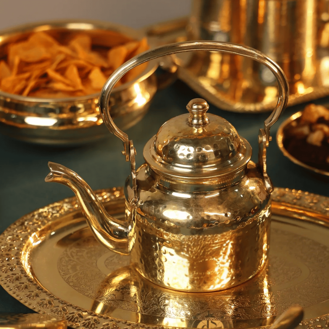 இந்த கைவினைப் பித்தளை நீர் கெட்டிலைப் பயன்படுத்தி நேர்த்தியுடன் பரிமாறவும், உங்கள் உணவு அல்லது அலங்கார அமைப்பிற்கு பாரம்பரிய அழகை காலத்தால் அழியாத பயன்பாட்டுடன் கலக்கவும்.