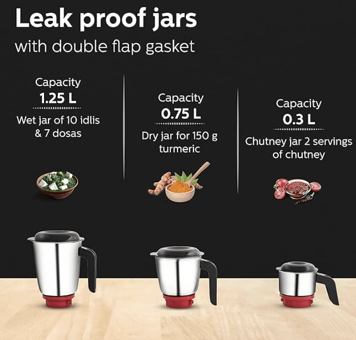 பிலிப்ஸ் HL7505/02 மிக்சர் கிரைண்டர், ரேபிட் கூல் மோட்டார் தொழில்நுட்பத்துடன் கூடிய 500W எண்டுரா மோட்டார், 3 ஹெவி டியூட்டி மற்றும் லீக் ப்ரூஃப் ஜாடிகள்