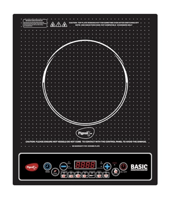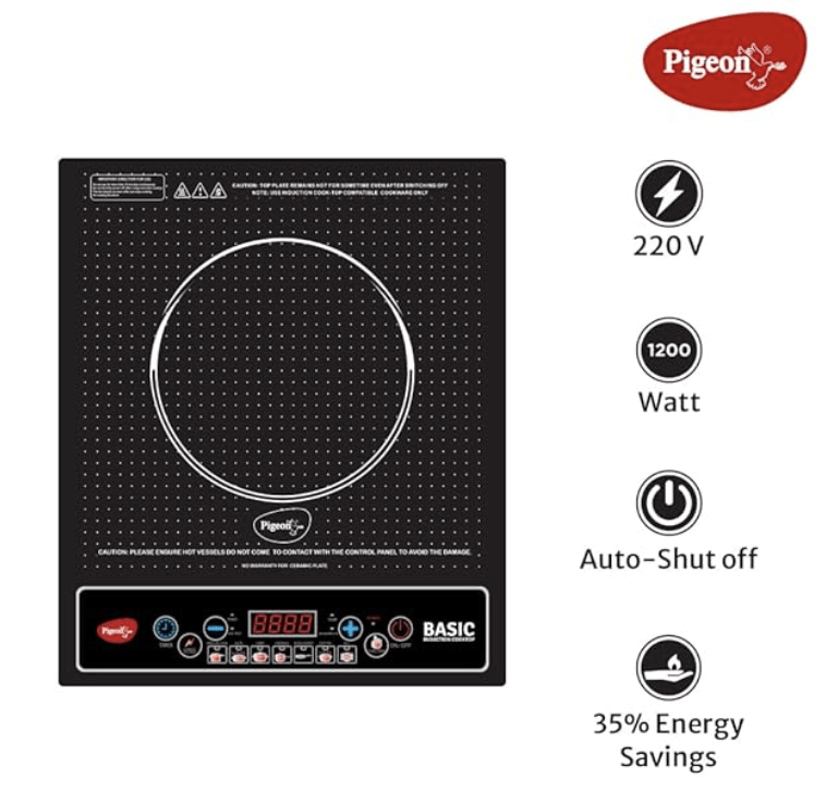 புறா பேசிக் இண்டக்ஷன் குக்டாப் 1200 W, ஆட்டோ-ஷட் ஆஃப், பவர் மற்றும் வெப்பநிலைக்கு 7 பிரிவு LED டிஸ்ப்ளே கொண்ட மென்மையான புஷ் பட்டன் - கருப்பு