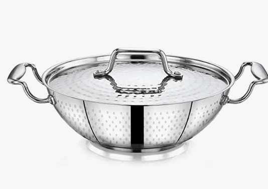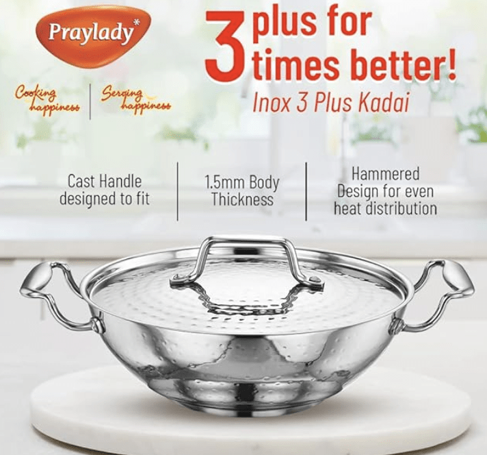 பிரேலேடி ஐநாக்ஸ் 3+ சீரிஸ் கடாய் - 26 செ.மீ | 3.0 லிட்டர் | கடாய் கூடுதல் ஆழம் | எஸ்எஸ் மூடியுடன் கூடிய சுத்தியல் செய்யப்பட்ட ஸ்டெயின்லெஸ் ஸ்டீல் கடாய் | பிளாட் இண்டக்ஷன் பாட்டம் கடாய் | இண்டக்ஷன் & கேஸ் ஸ்டவ் ஃப்ரெண்ட்லி | சில்வர்