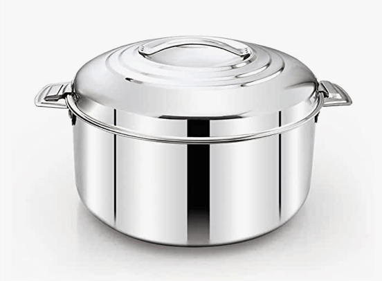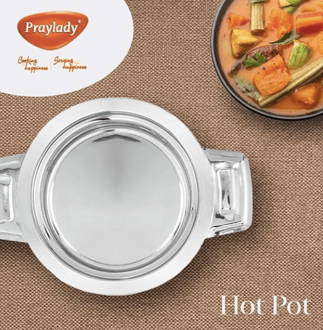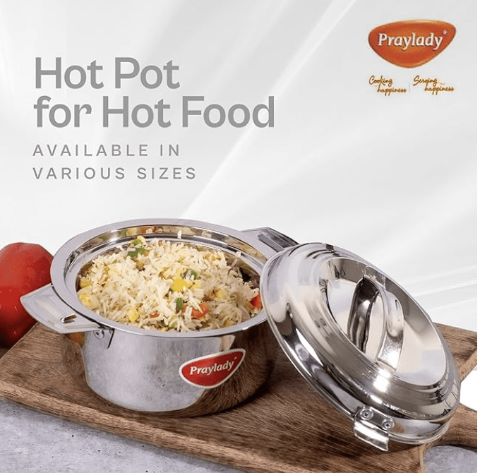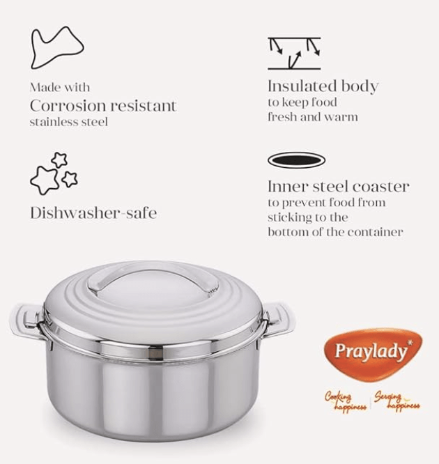 பிரேலேடி ரெகுலர் ஹாட் பாட் 5000 ML | ஸ்டெயின்லெஸ் ஸ்டீல் இன்சுலேட்டட் | ஹாட் பாட் | ரொட்டி கொள்கலன் | கேசரோல் | 100% ஸ்டெயின்லெஸ் ஸ்டீல் | வெப்ப ஆயுள் | இலகுரக | தனித்துவமான பூட்டுதல் அமைப்பு | டைனிங்-டேபிளின் தோற்றத்தை சிறப்பாக மேம்படுத்த | வெள்ளி