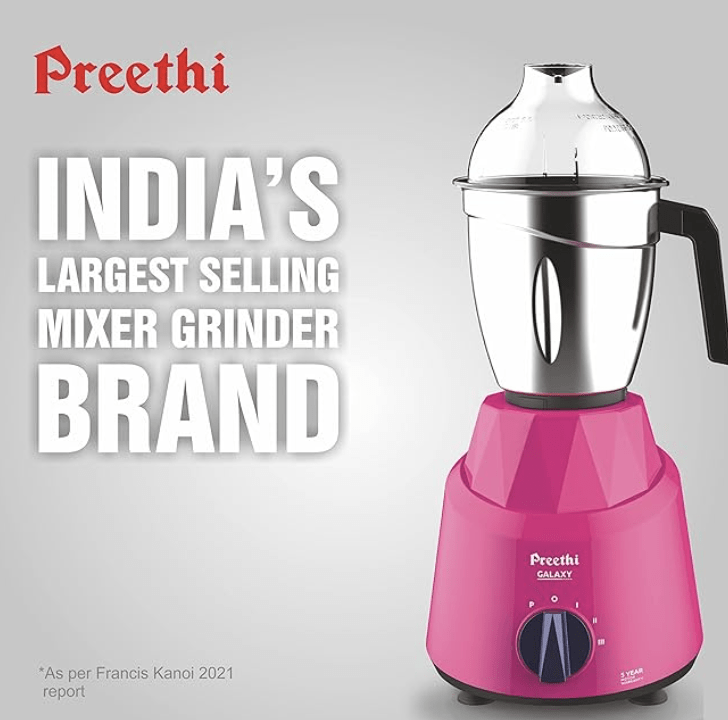 ப்ரீத்தி கேலக்ஸி MG225 மிக்சர் கிரைண்டர், 750 வாட், பிங்க், 3 ஜாடிகள், வேகா W5 மோட்டார் 5 வருட உத்தரவாதம் & வாழ்நாள் இலவச சேவை | பிளாஸ்டிக்