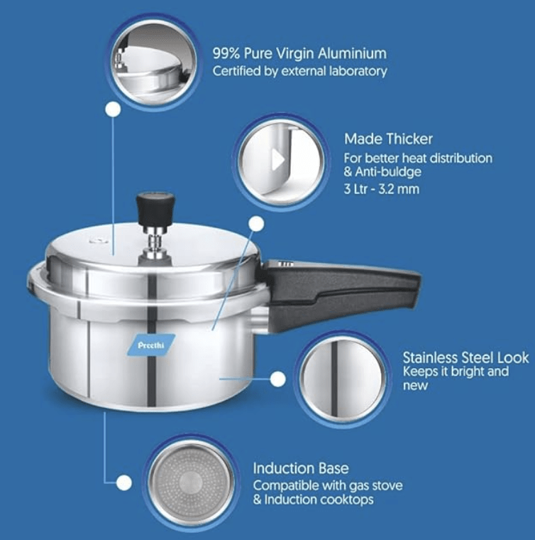 ப்ரீத்தி இண்டக்ஷன் பேஸ் அலுமினியம் அவுட்டர் லிட் பிரஷர் குக்கர், 3 லிட்டர்