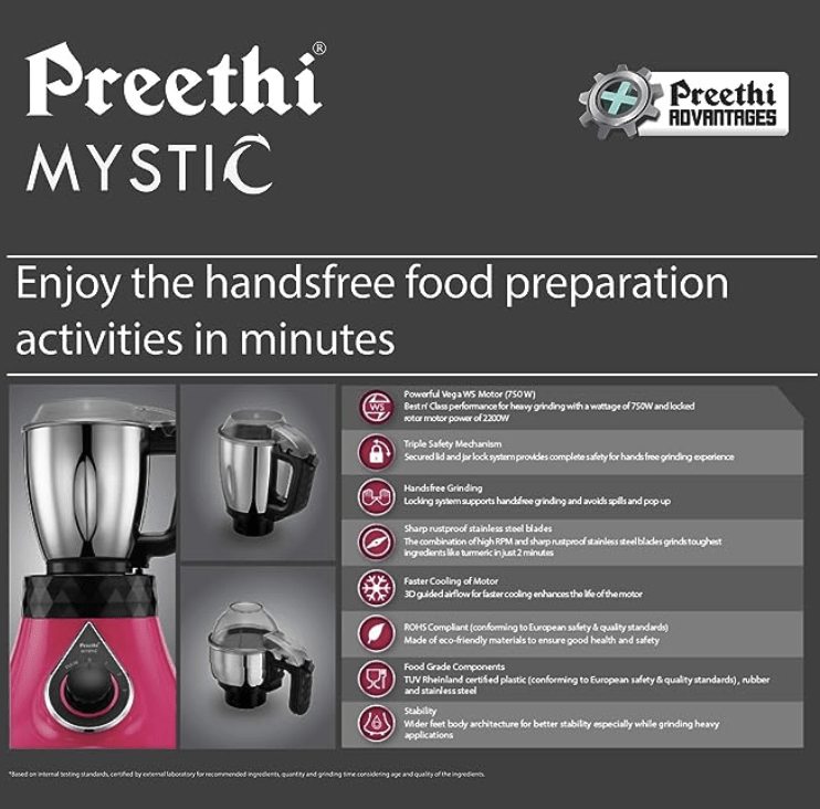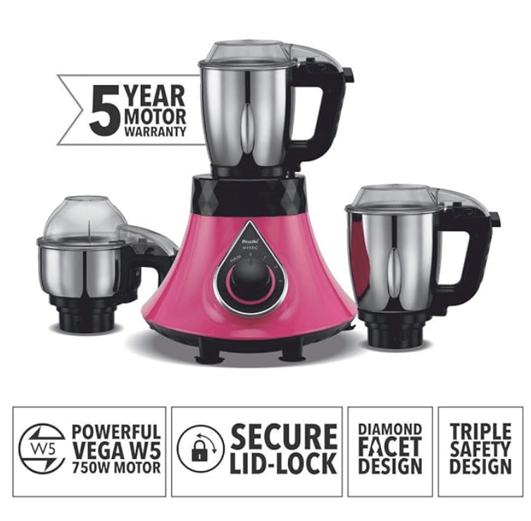ப்ரீத்தி மிஸ்டிக் எம்ஜி238 மிக்சர் கிரைண்டர், 3 ஜாடிகளுடன் 750 வாட், பிங்க்