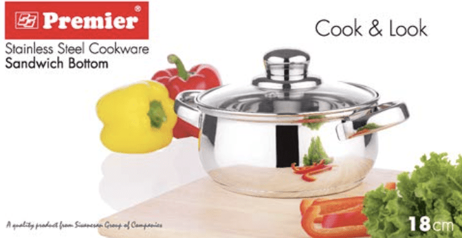 பிரீமியர் ஸ்டெயின்லெஸ் ஸ்டீல் குக் & லுக் வித் கிளாஸ் மூடி வித் சாண்ட்விச் பாட்டம் 18CM CODE-0061811