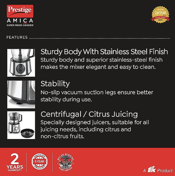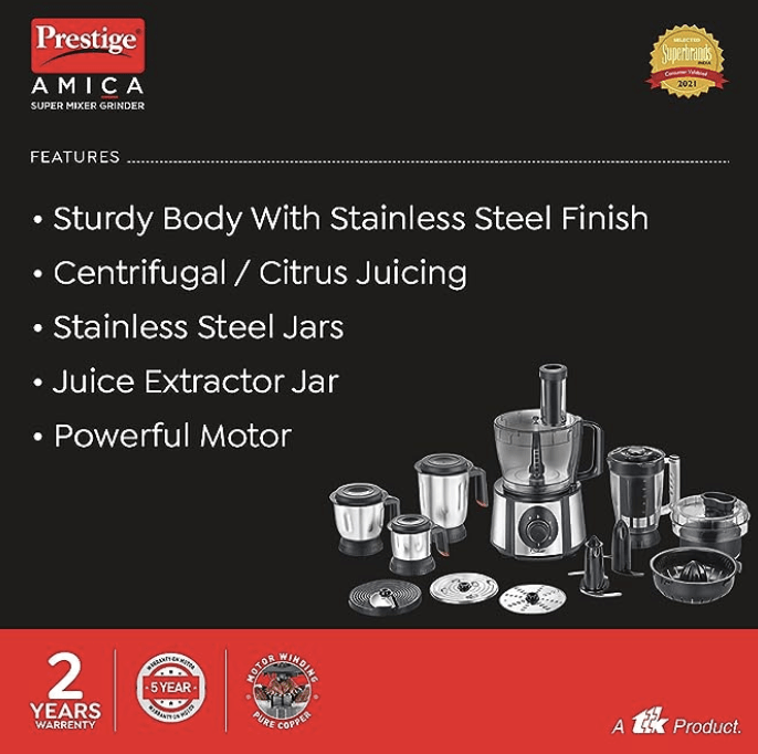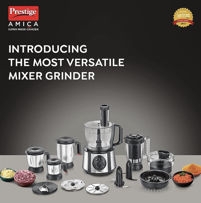 பிரெஸ்டீஜ் 1000 W அமிகா சூப்பர் மிக்சர் கிரைண்டர்| பல துணைக்கருவிகள் கொண்ட 5 ஜாடிகள் (ஸ்லைசர், ஷ்ரெடர், ஃபிங்கர் சிப் டிஸ்க், சாப்பர், பிசைப்பான்)| தயாரிப்புக்கு 2 ஆண்டுகள் உத்தரவாதம் & மோட்டாருக்கு 5 ஆண்டுகள் உத்தரவாதம்| (கருப்பு மற்றும் வெள்ளி)