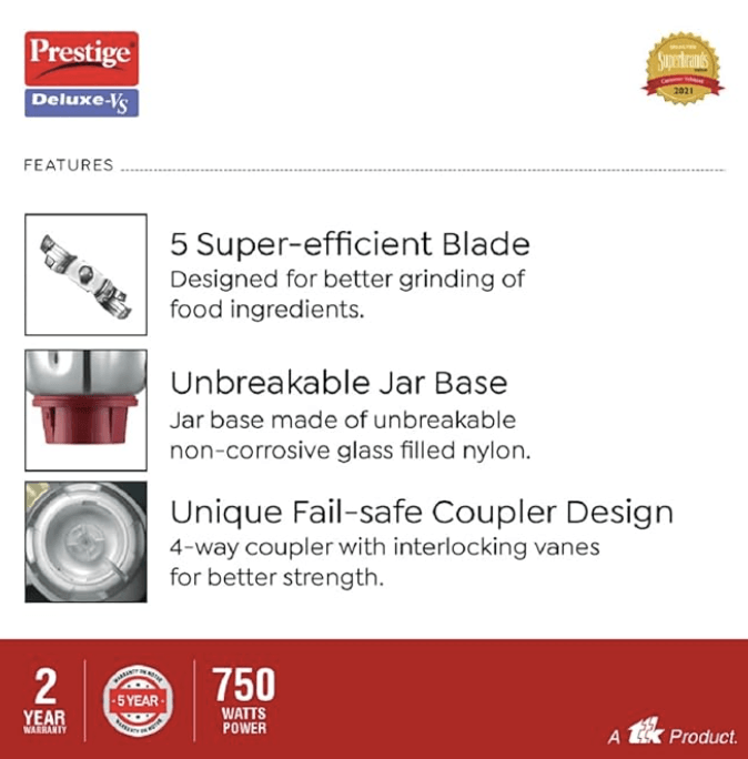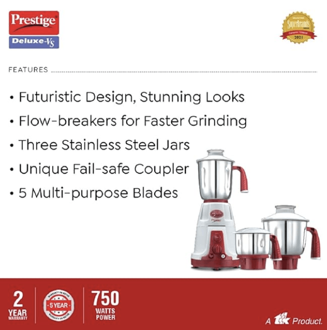 பிரெஸ்டீஜ் டீலக்ஸ் VS (750 வாட்) மிக்சர் கிரைண்டர் 3 ஸ்டெயின்லெஸ் ஸ்டீல் ஜாடியுடன்