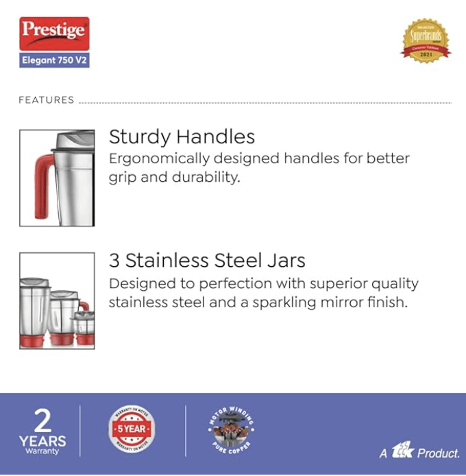 பிரெஸ்டீஜ் எலிகண்ட் V2 மிக்சர் கிரைண்டர் 750 வாட்