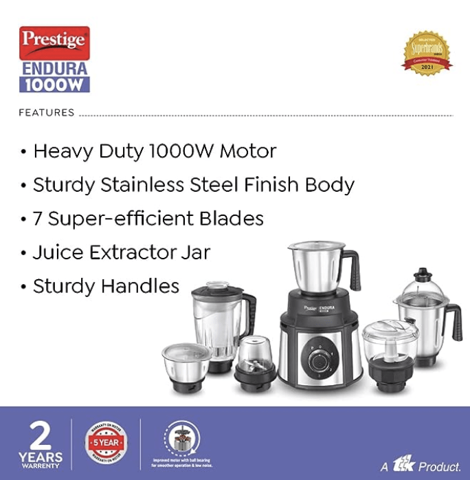 பிரெஸ்டீஜ் எண்டூரா 1000W மிக்சர் கிரைண்டர், 6 ஜாடிகள் (1500 மிலி, 1000 மிலி, 1500 மிலி, 450 மிலி) (கருப்பு, வெள்ளி)