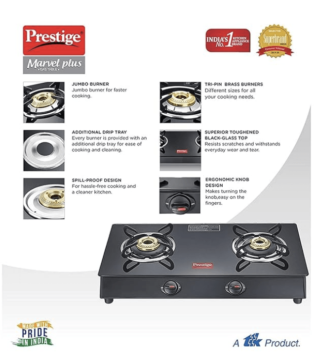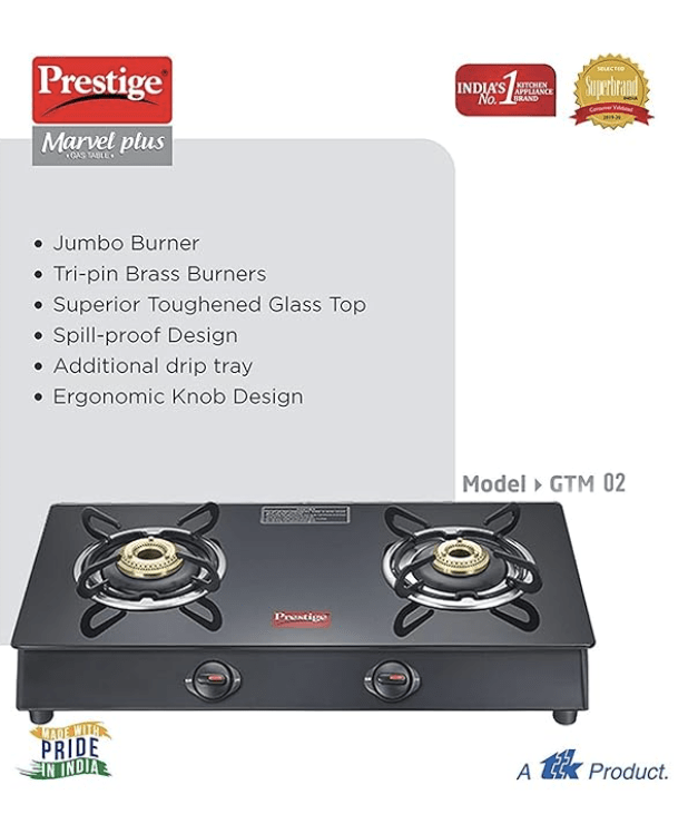 பிரெஸ்டீஜ் மார்வெல் பிளஸ் 2 பர்னர் கிளாஸ் டாப், கேஸ் ஸ்டவ் (ஜிடிஎம் 02, கருப்பு) - மேனுவல் இக்னிஷன்