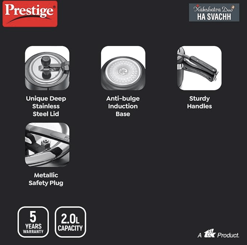 பிரெஸ்டீஜ் நட்சத்திரா டியோ பிளஸ் ஸ்வச் ஹார்ட் அனோடைஸ்டு அலுமினிய பிரஷர் குக்கர் 2.0 எல், கருப்பு