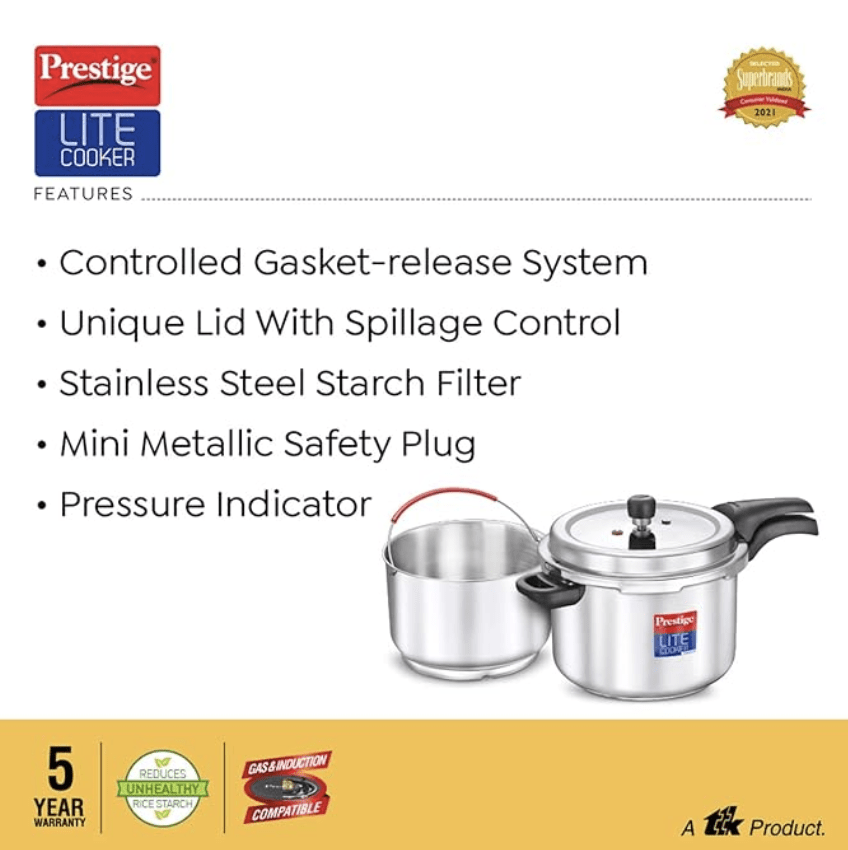 பிரெஸ்டீஜ் ஸ்வச் லைட் ஸ்டெயின்லெஸ் ஸ்டீல் அவுட்டர் லிட் பிரஷர் குக்கர், ஸ்டெயின்லெஸ் ஸ்டீல் ஸ்டார்ச் ஃபில்டருடன், 4 லிட்டர், 4 லிட்டர்