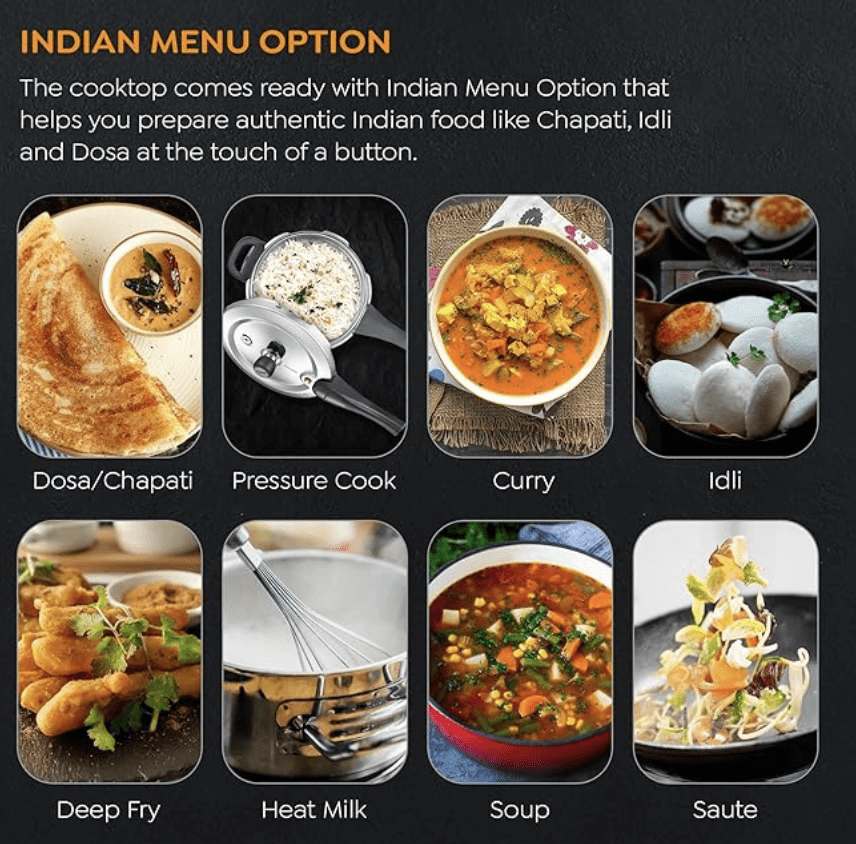 ஒரு பொத்தானைத் தொடுவதன் மூலம் உண்மையான இந்திய உணவைத் தயாரிக்க உதவுகிறது. கிடைக்கக்கூடிய பல்வேறு முன்னமைவுகளிலிருந்து தேர்வு செய்யவும். புஷ் பட்டன் கட்டுப்பாடுகள்