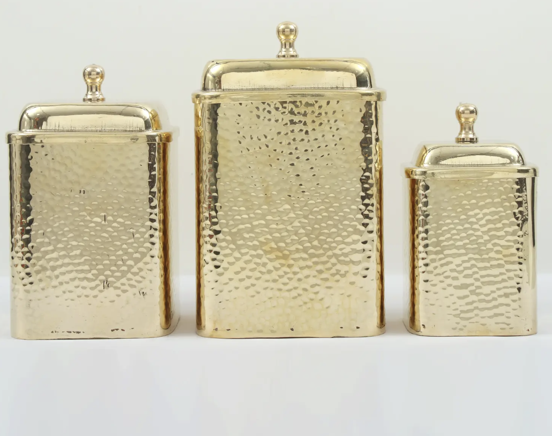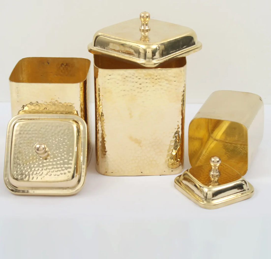 தூய பித்தளை கையால் சுத்தியல் செய்யப்பட்ட 3 கொள்கலன் தொகுப்பு – பாரம்பரிய சமையலறை சேமிப்பு ஜாடிகள்